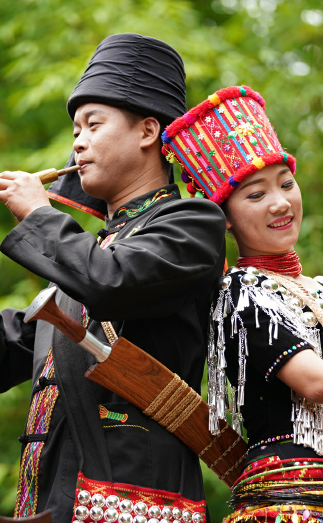 云南壯族主要聚居在文山州,人口114萬,民間的村寨大多依山傍水。壯族擅長種植水稻,有太陽崇拜和長老崇拜的風(fēng)俗,視銅鼓為重器,厚愛銀飾,善烹制五色花米飯,能歌善舞,熱情好客。進入景區(qū)壯族村,迎面有祭祀龍王的龍柱,兩邊是先民繪制的天王崖畫和為紀(jì)念傳說洪水泛濫時幫助先民度過劫難而建的石葫蘆亭。祭祀玉皇大帝的昊天閣和傳說能驅(qū)邪納福的碩大銅鼓聳立在廣場兩側(cè)。桿欄式和麻欄式民居、壯族青年社交休憩的“情廊”、村...